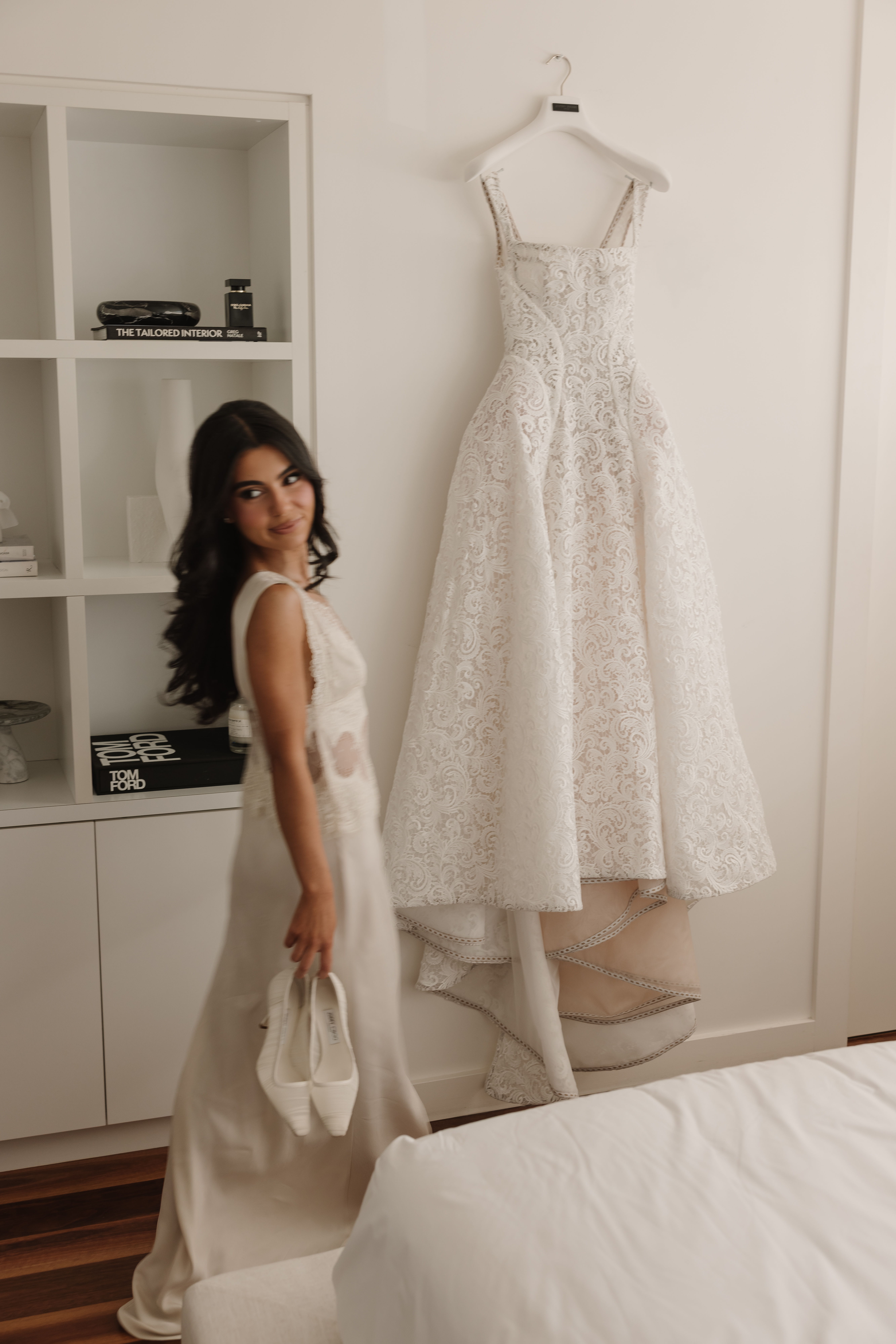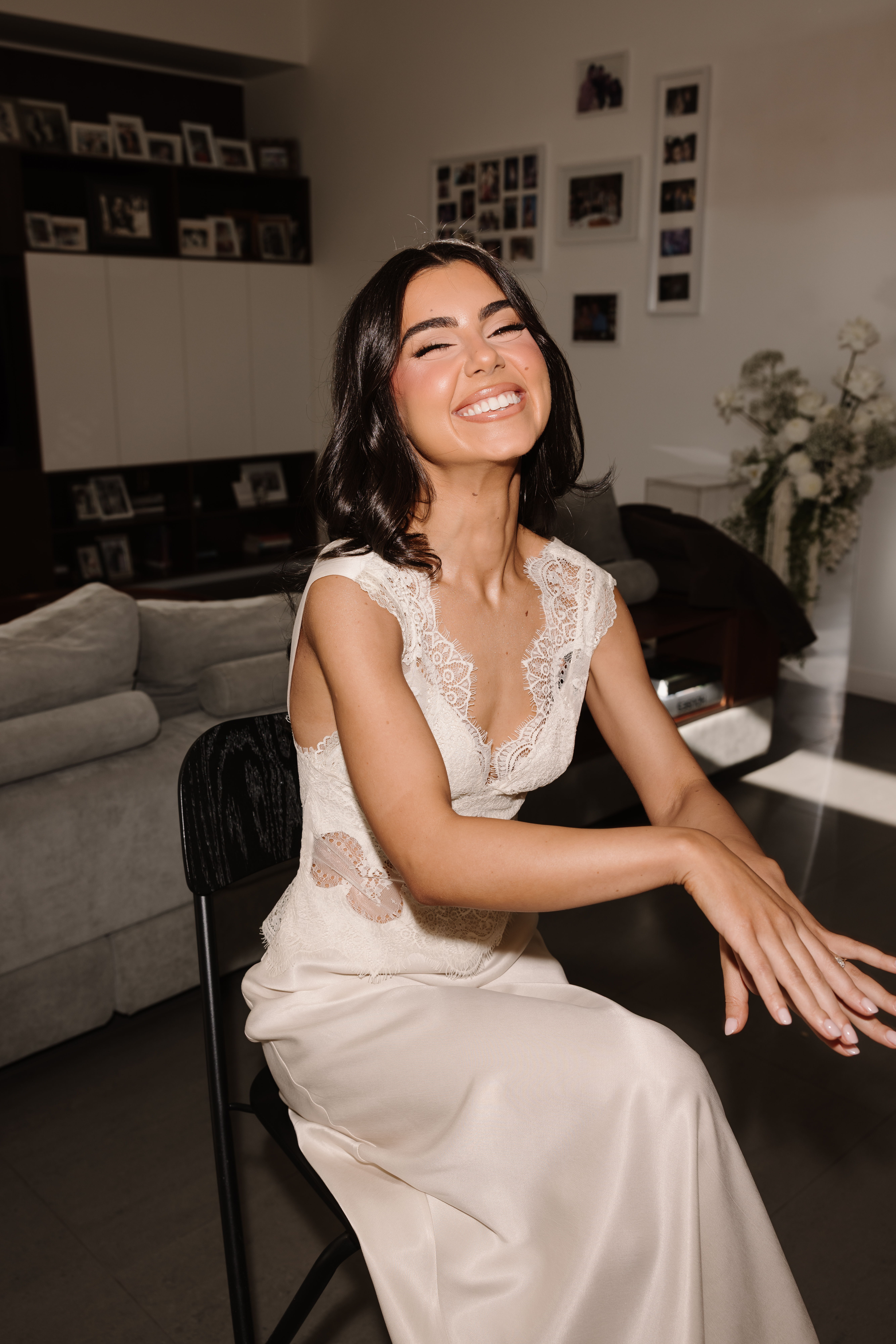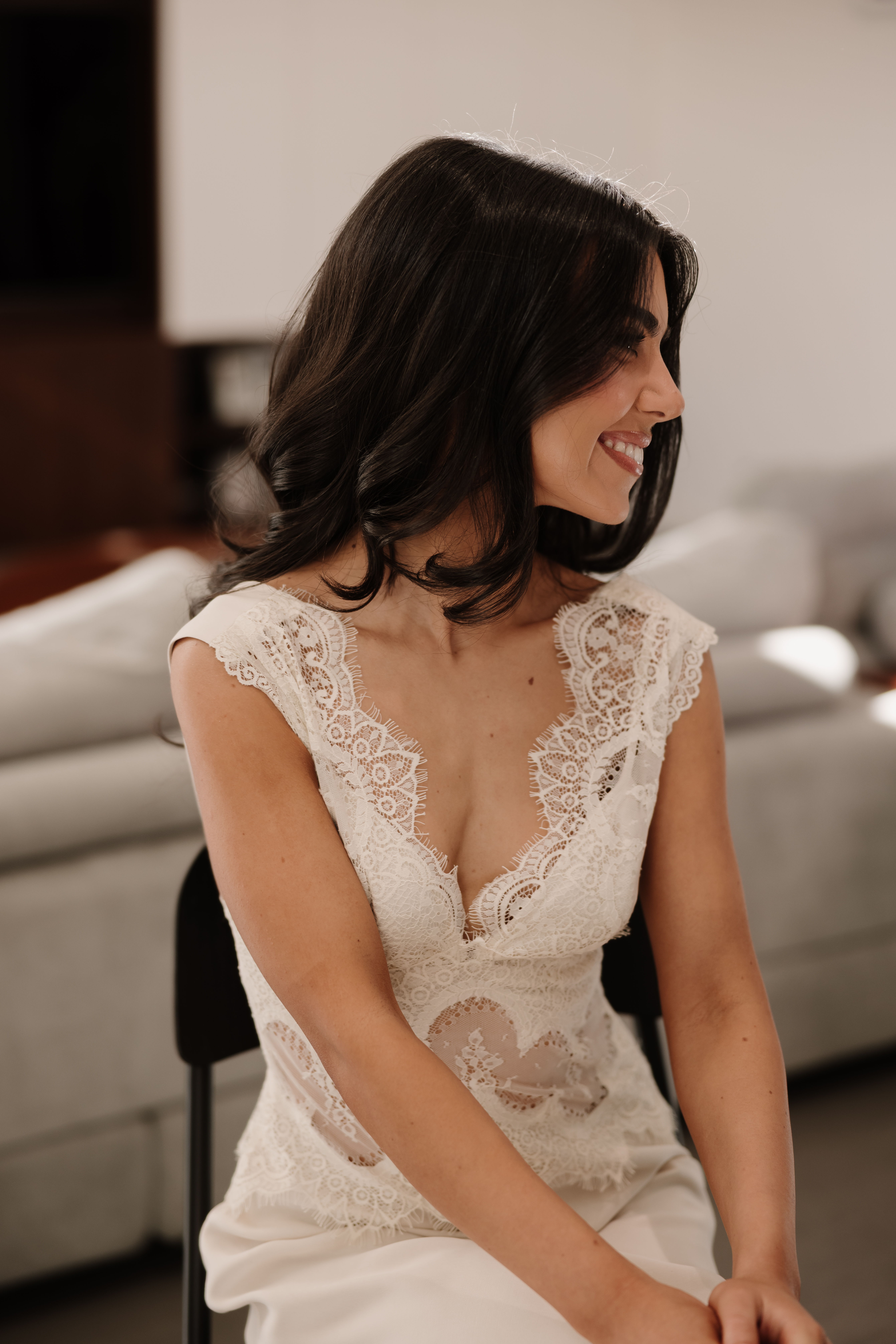 Initially, I was set on wearing a silk long-sleeve top and pants set for the morning-of, but the moment I tried on the Visions Lace Dress, that idea went out the window. The lace tied in beautifully with my wedding dress, but in its own completely different, softer way. It felt cohesive without being overly matching. Once I found that, everything else fell into place. I ended up choosing a slip dress with lace detailing for my bridesmaids, and together the textures, tones, and silhouettes all tied in perfectly across the entire morning.