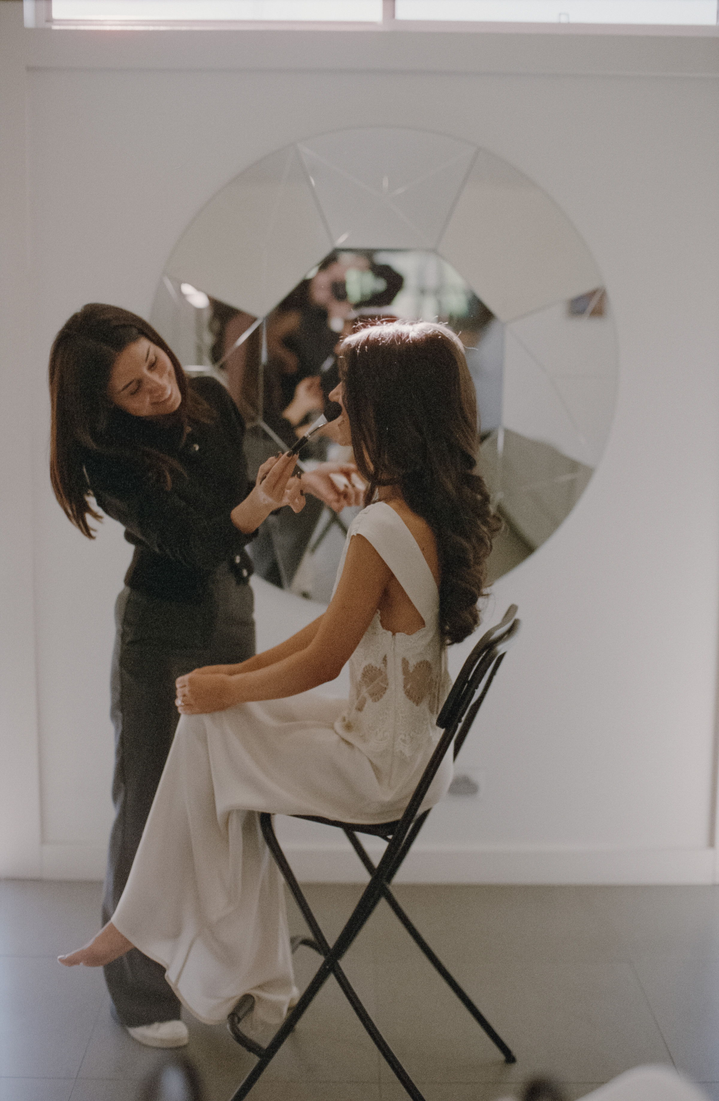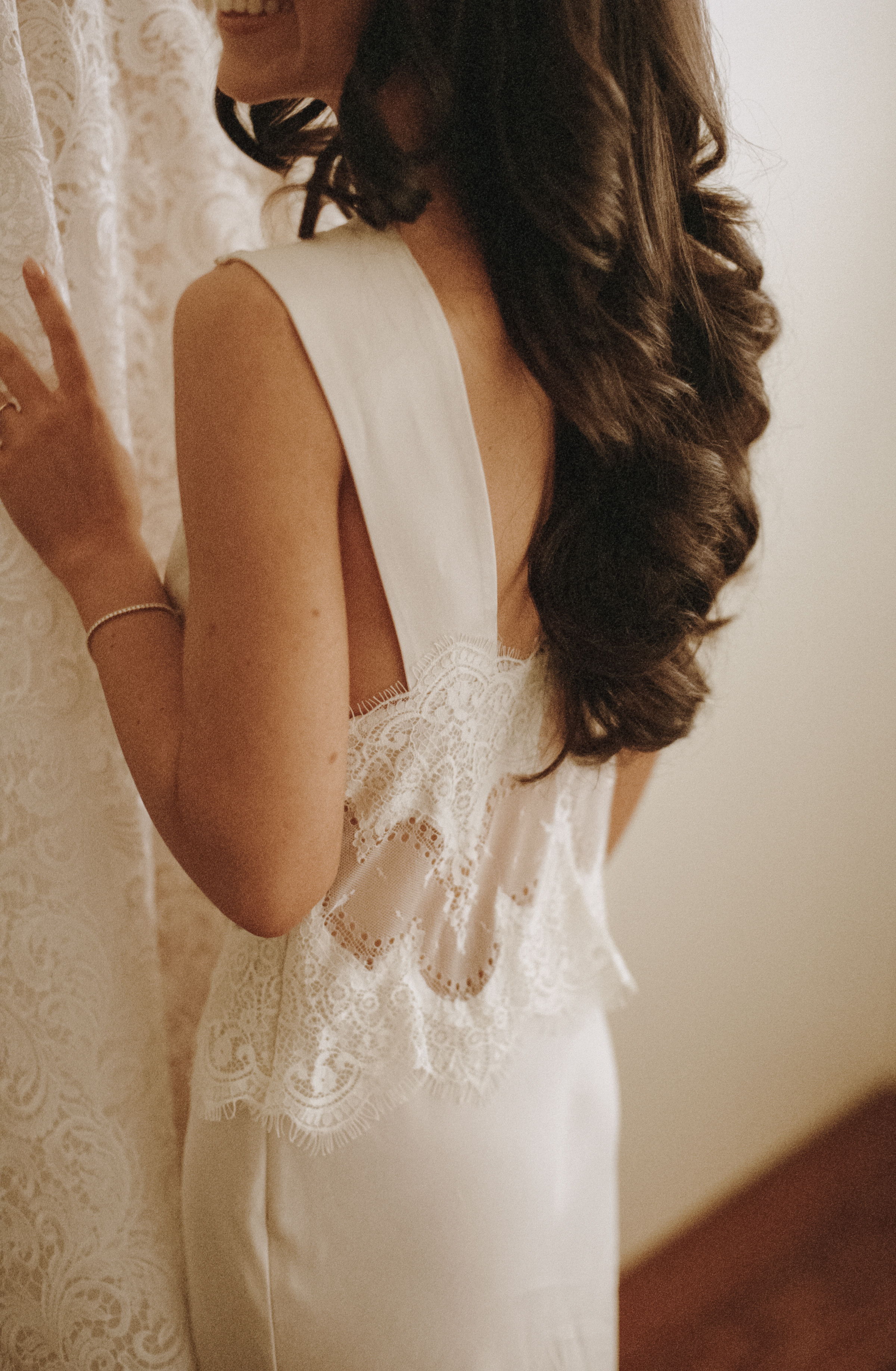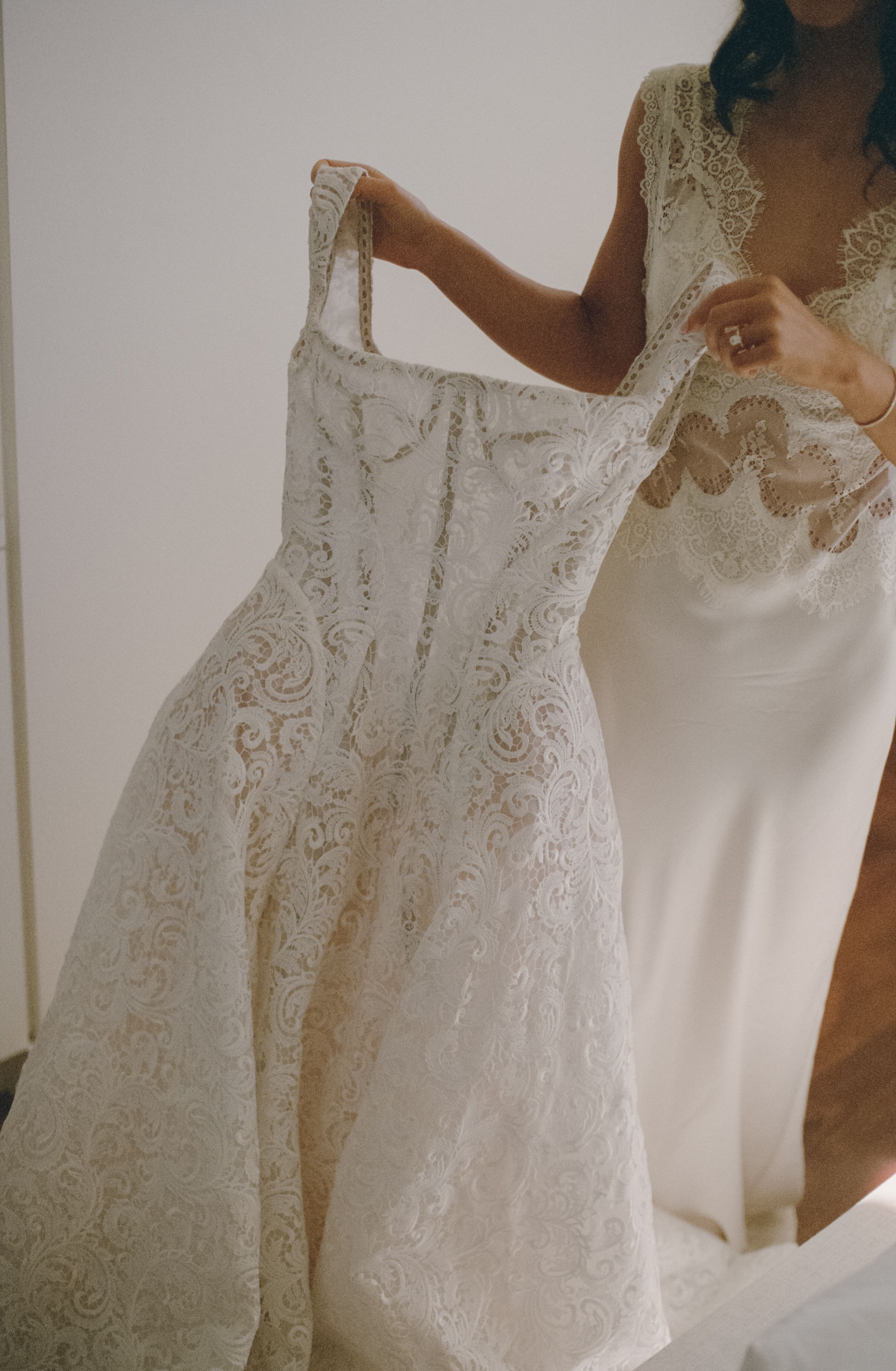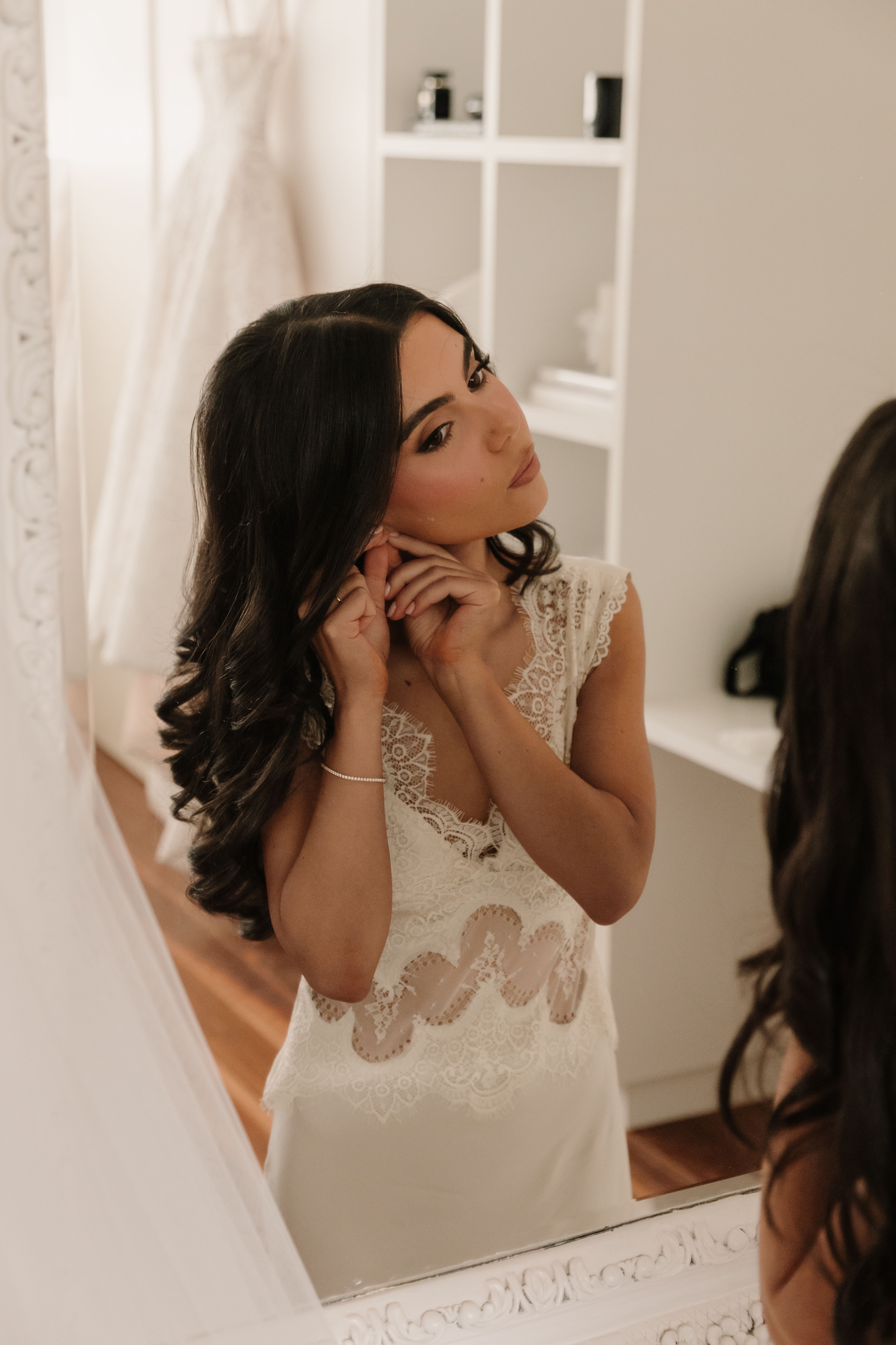 Initially, I was set on wearing a silk long-sleeve top and pants set for the morning-of, but the moment I tried on the Visions Lace Dress, that idea went out the window. The lace tied in beautifully with my wedding dress, but in its own completely different, softer way. It felt cohesive without being overly matching. Once I found that, everything else fell into place. I ended up choosing a slip dress with lace detailing for my bridesmaids, and together the textures, tones, and silhouettes all tied in perfectly across the entire morning.