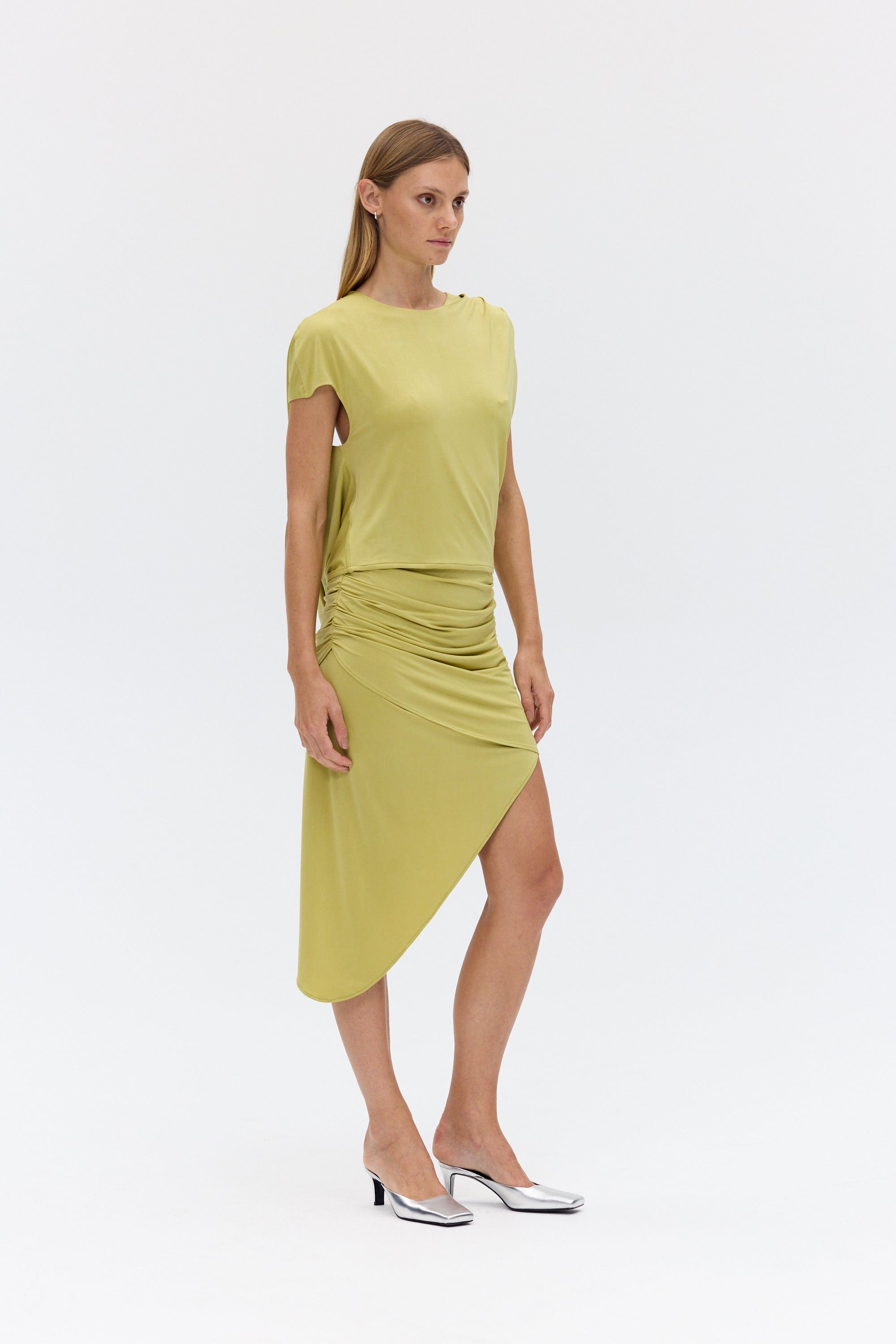 - Cut-out draped back with tucked detail on the wearer’s left shoulder