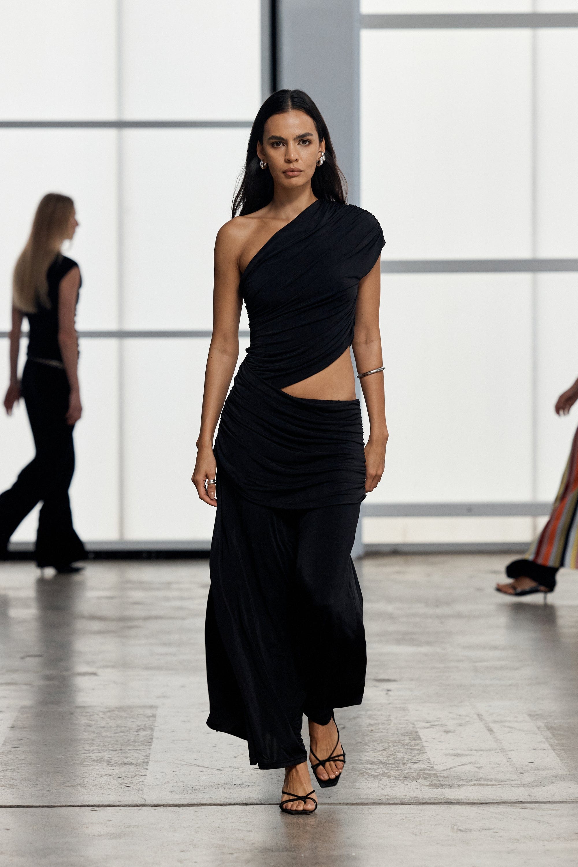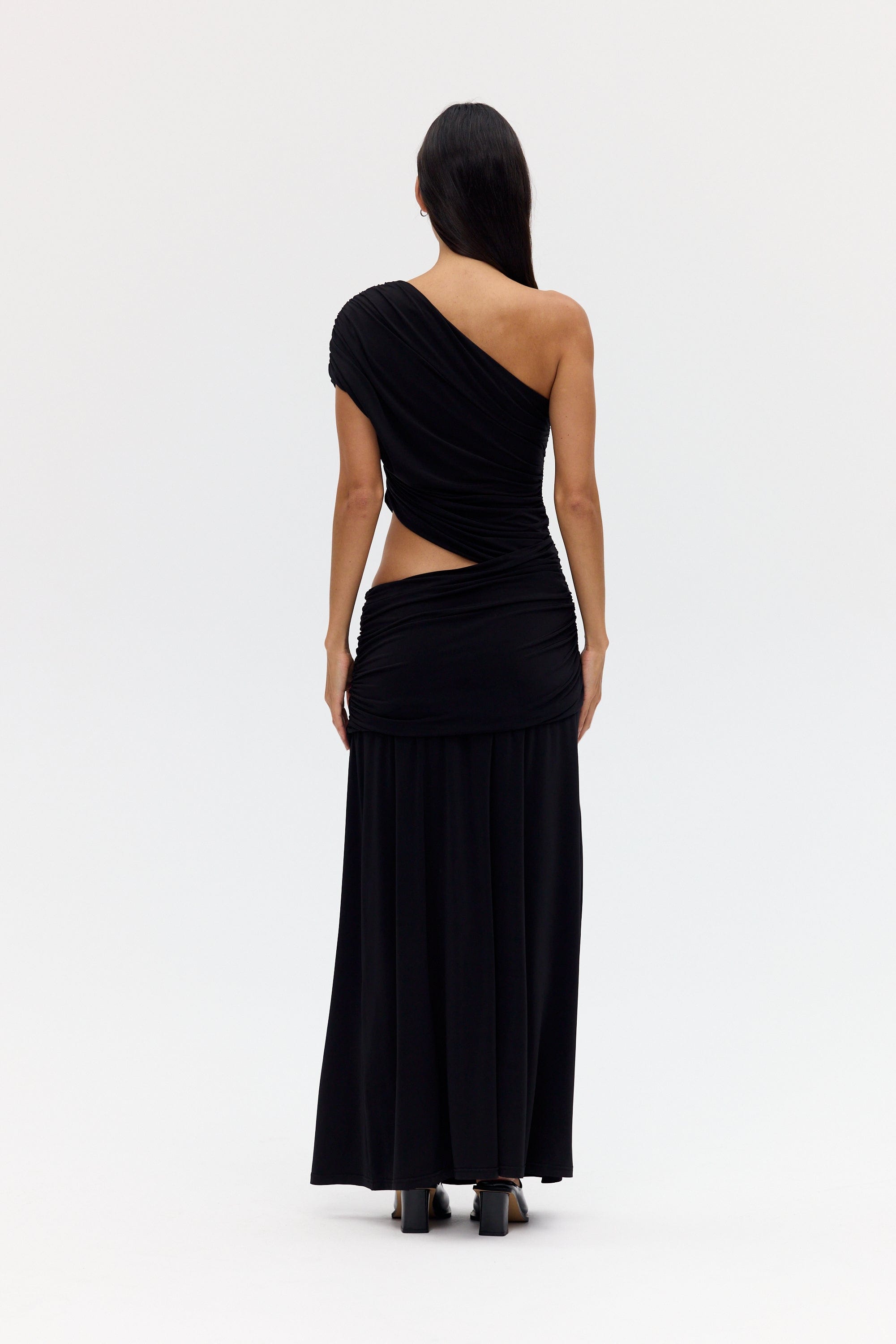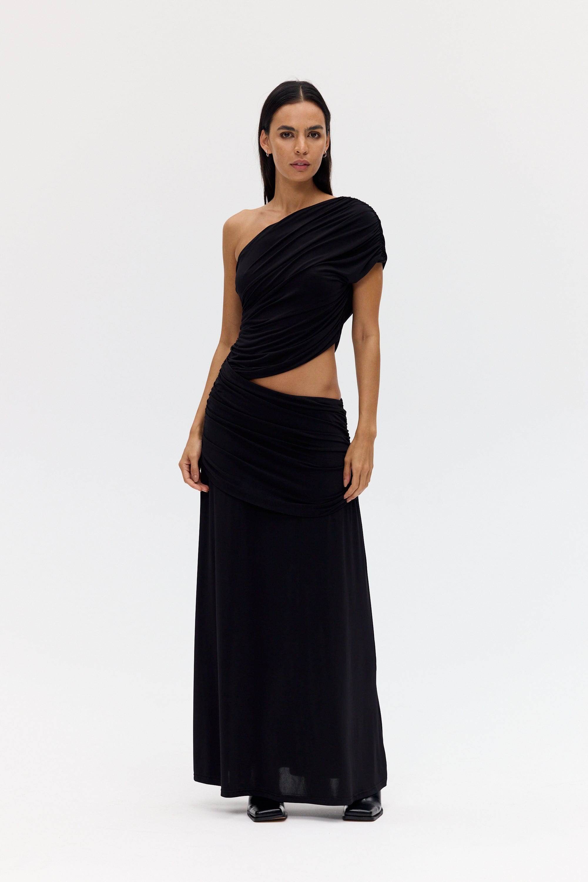 • One-shoulder cut-out maxi with gathered asymmetric bodice and cap sleeves
