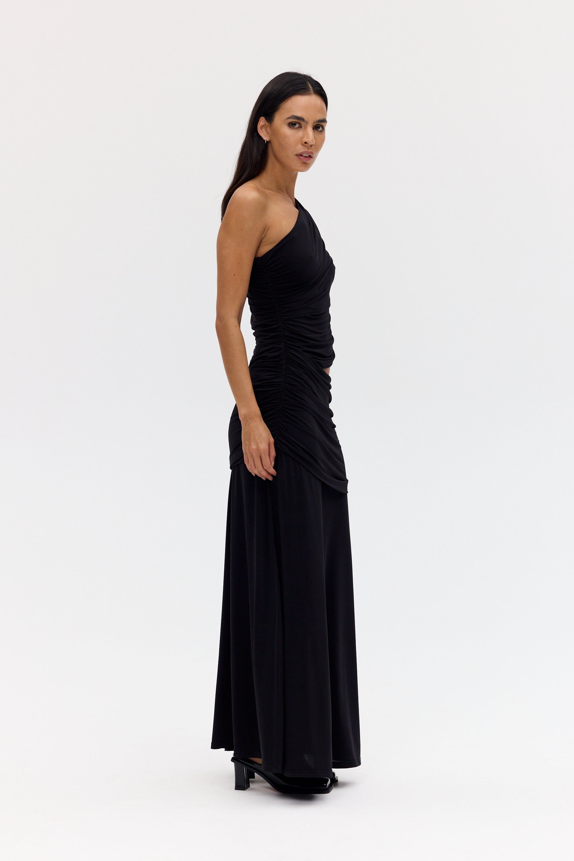 The Crave Ruched Floor Length Dress is defined by its directional lines and fluid draping. Cut to a fitted silhouette, its one-shoulder design is softly gathered at the bodice and side seams to create a sculptural effect. A concealed elastic waistband and invisible side zip ensure a seamless fit, while the flared skirt brings a dynamic finish to this elegant piece.