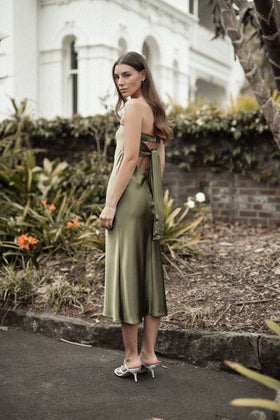 • SATIN TIE BACK STRAPLESS MIDI | BLACK