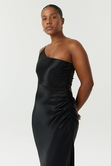 • SATIN GATHER ONE SHOULDER DRESS | BLACK