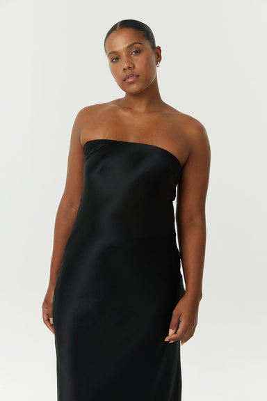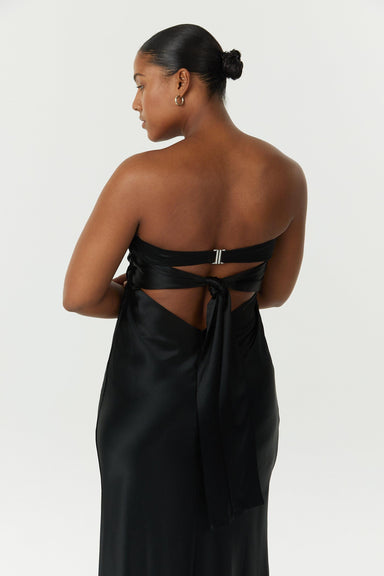 • SATIN TIE BACK STRAPLESS MAXI | BLACK