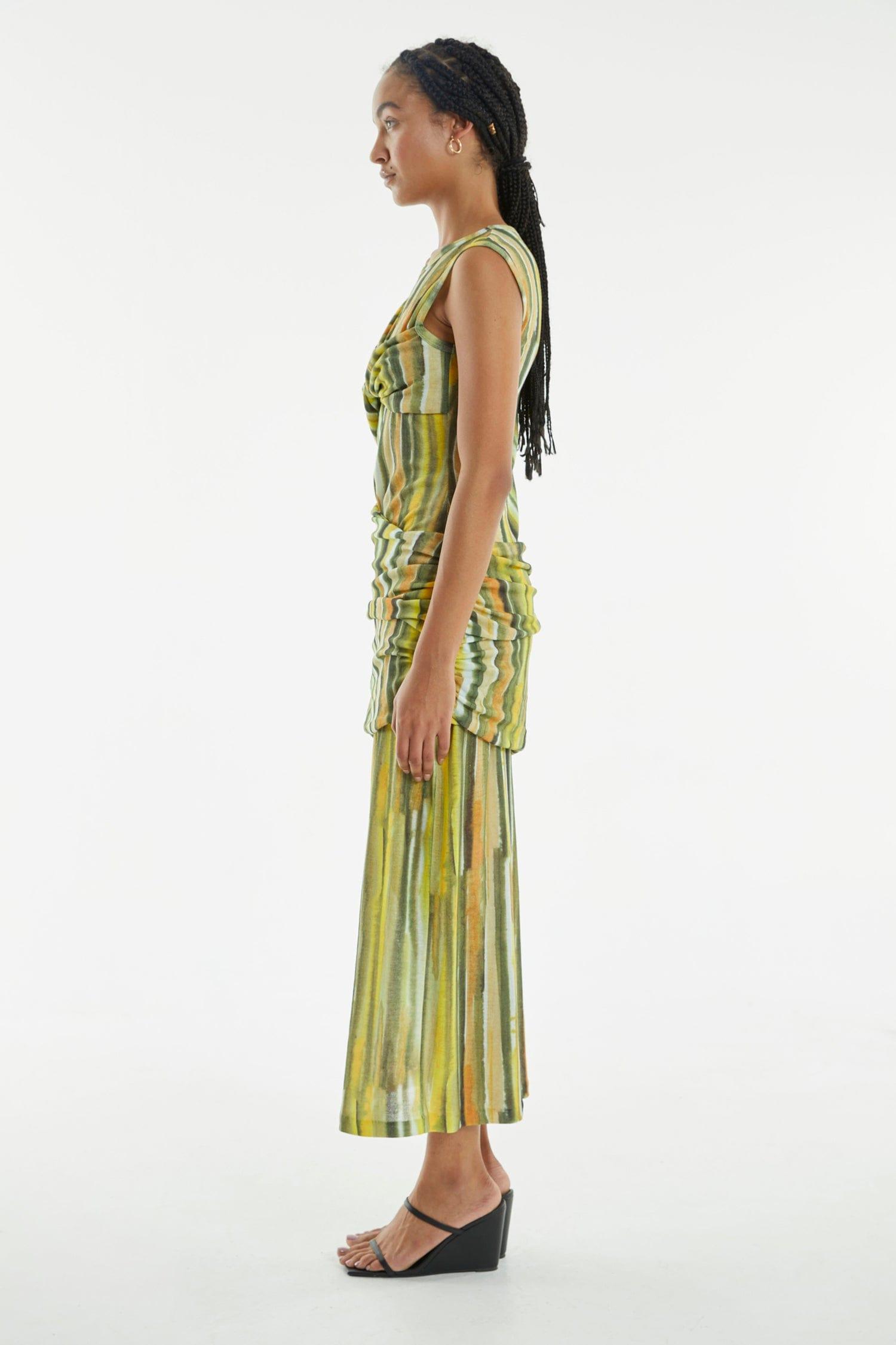 The Wind Through Tank Dress, adorned with the exclusive Brush Stroke print by Third Form, has reimagined the classic tank style with a modern twist. Meticulously crafted from lightweight Rayon fabric, this dress showcases an enchanting silhouette and incorporates self-fabric ruched layering over the bust and waistline, providing both style and coverage. With its semi-sheer finish and breezy feel, this dress becomes the quintessential summer staple for your wardrobe.