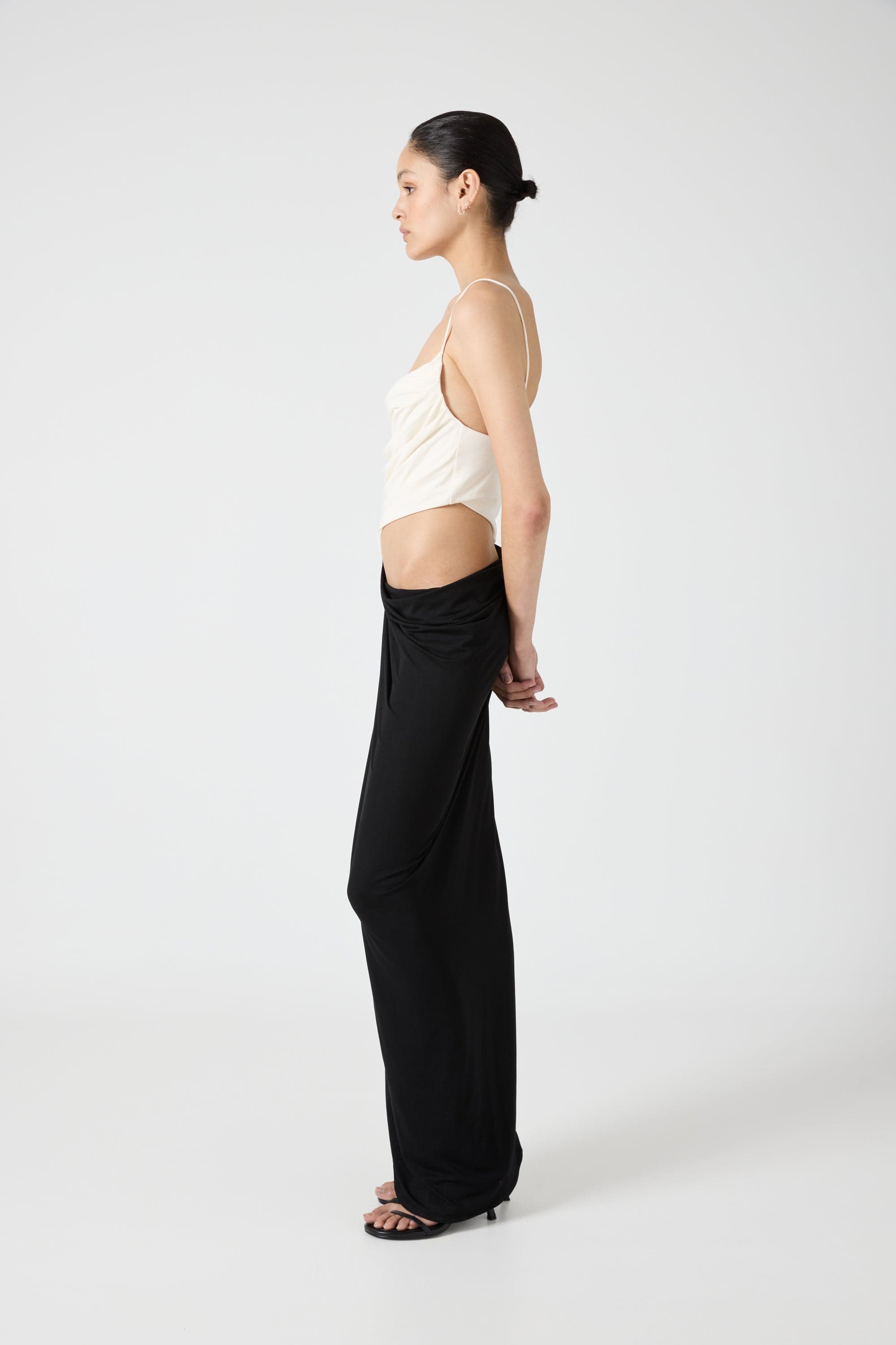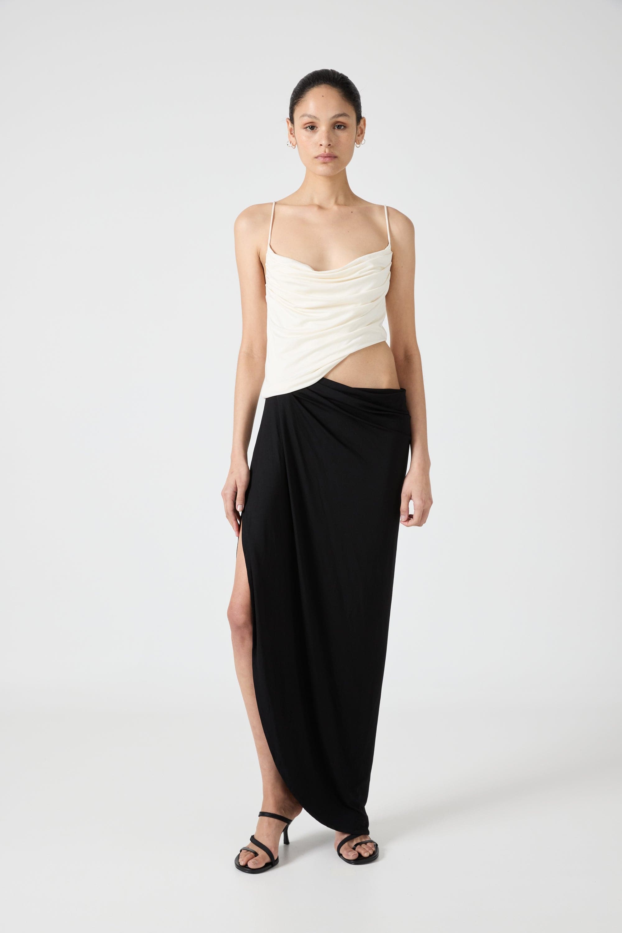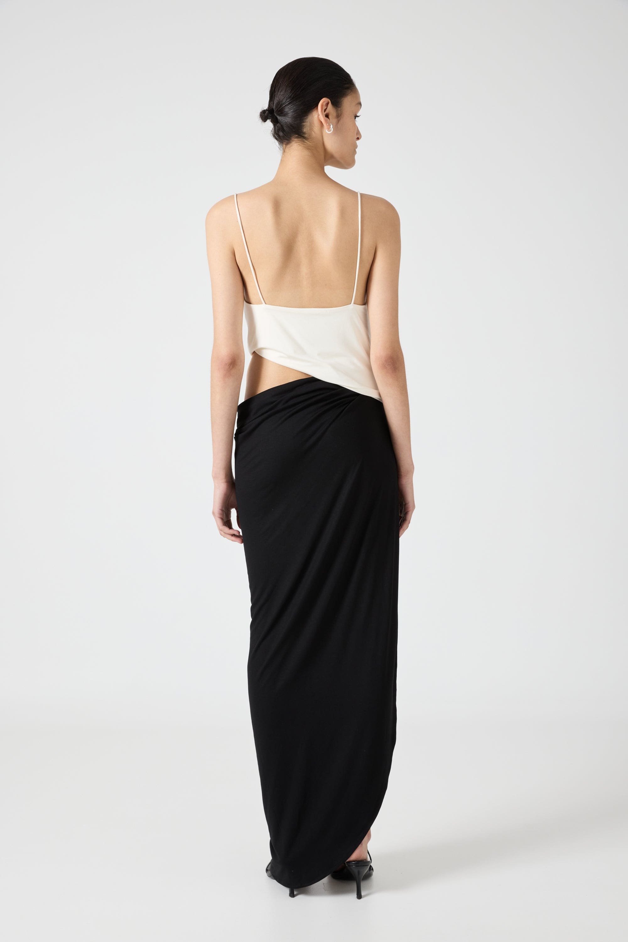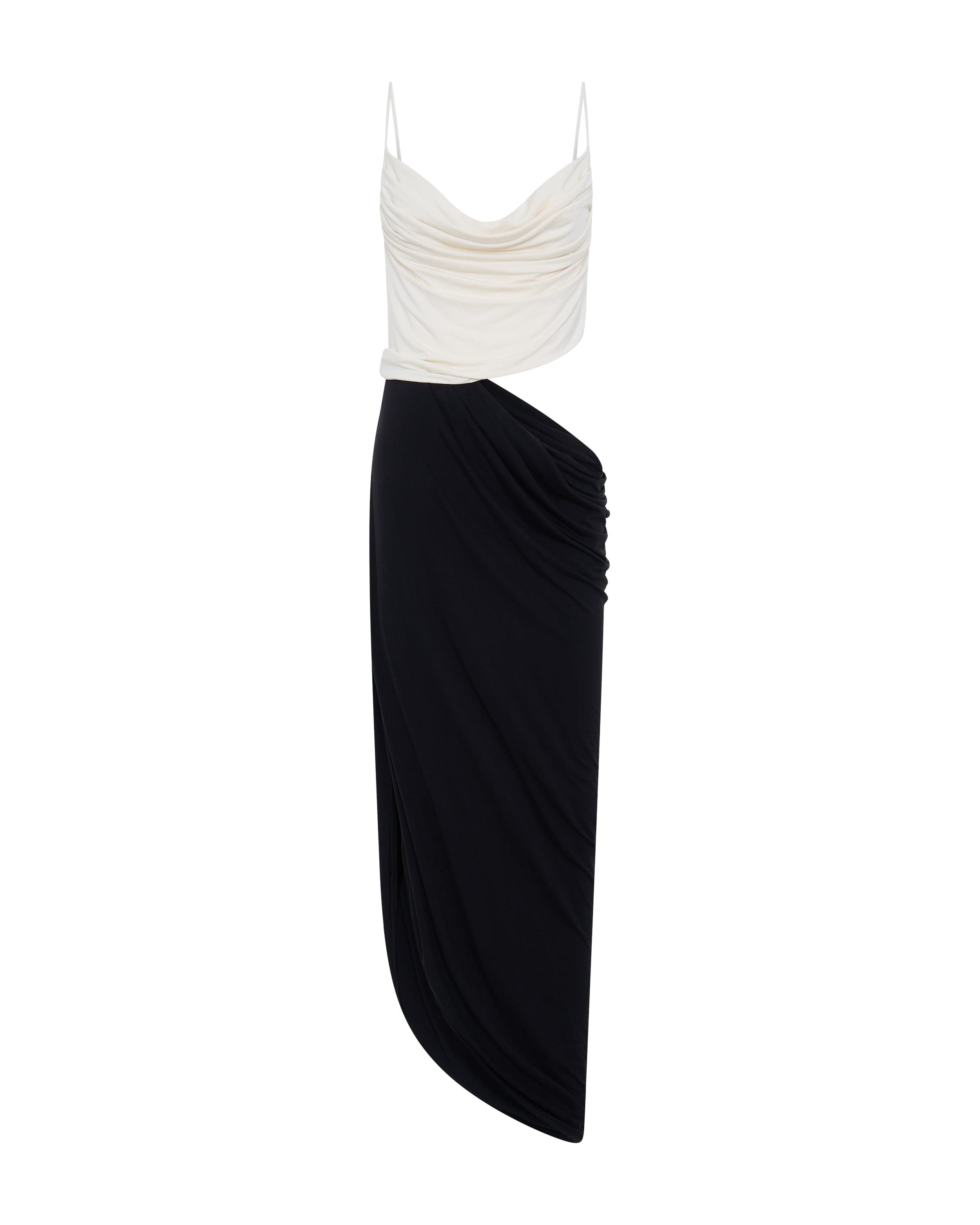 CASCADE DRAPE JERSEY DRESS | CREAM/BLACK