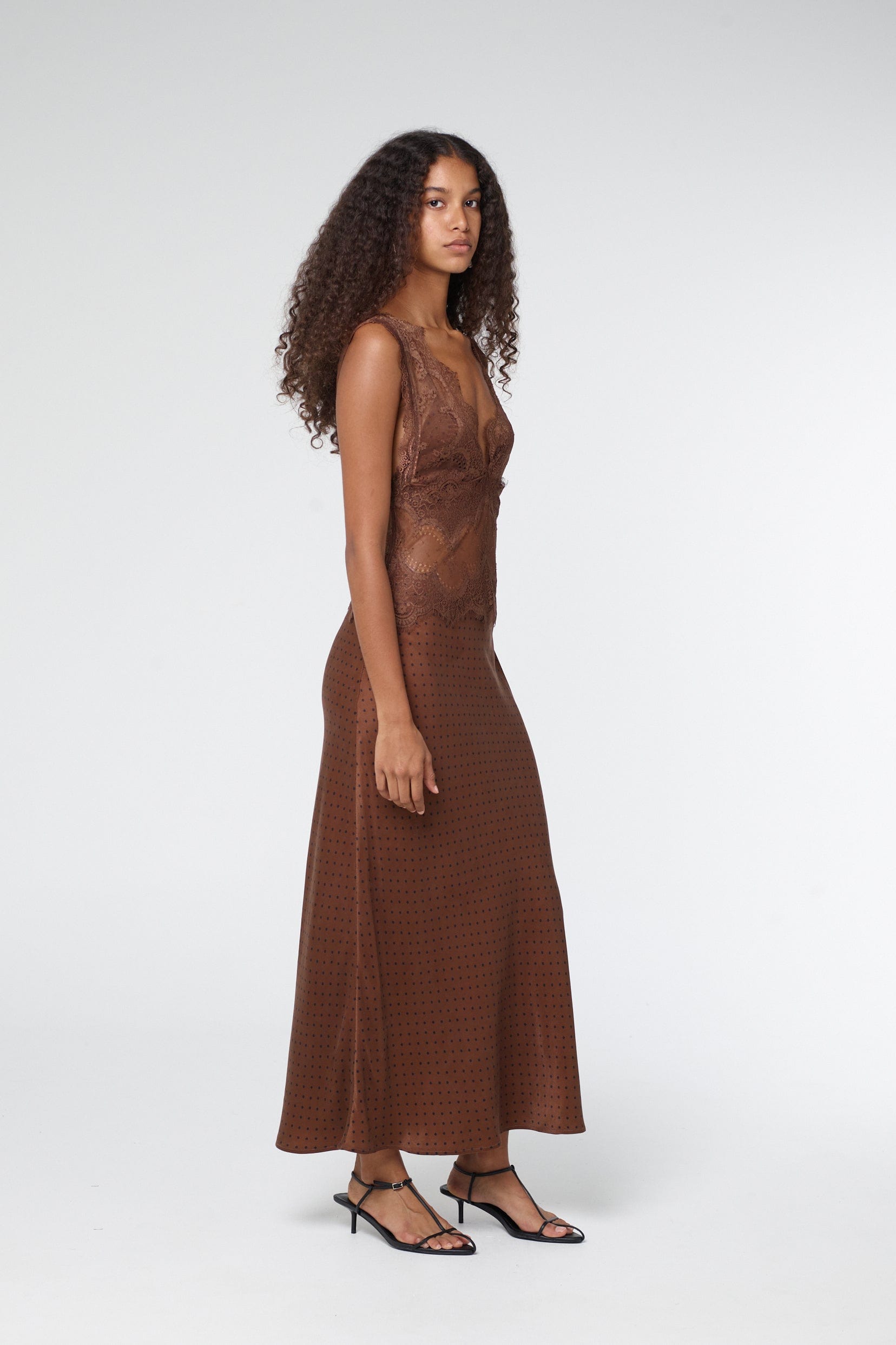 VISIONS LACE DEEP V MAXI DRESS | CHOCOLATE POLKA DOT
