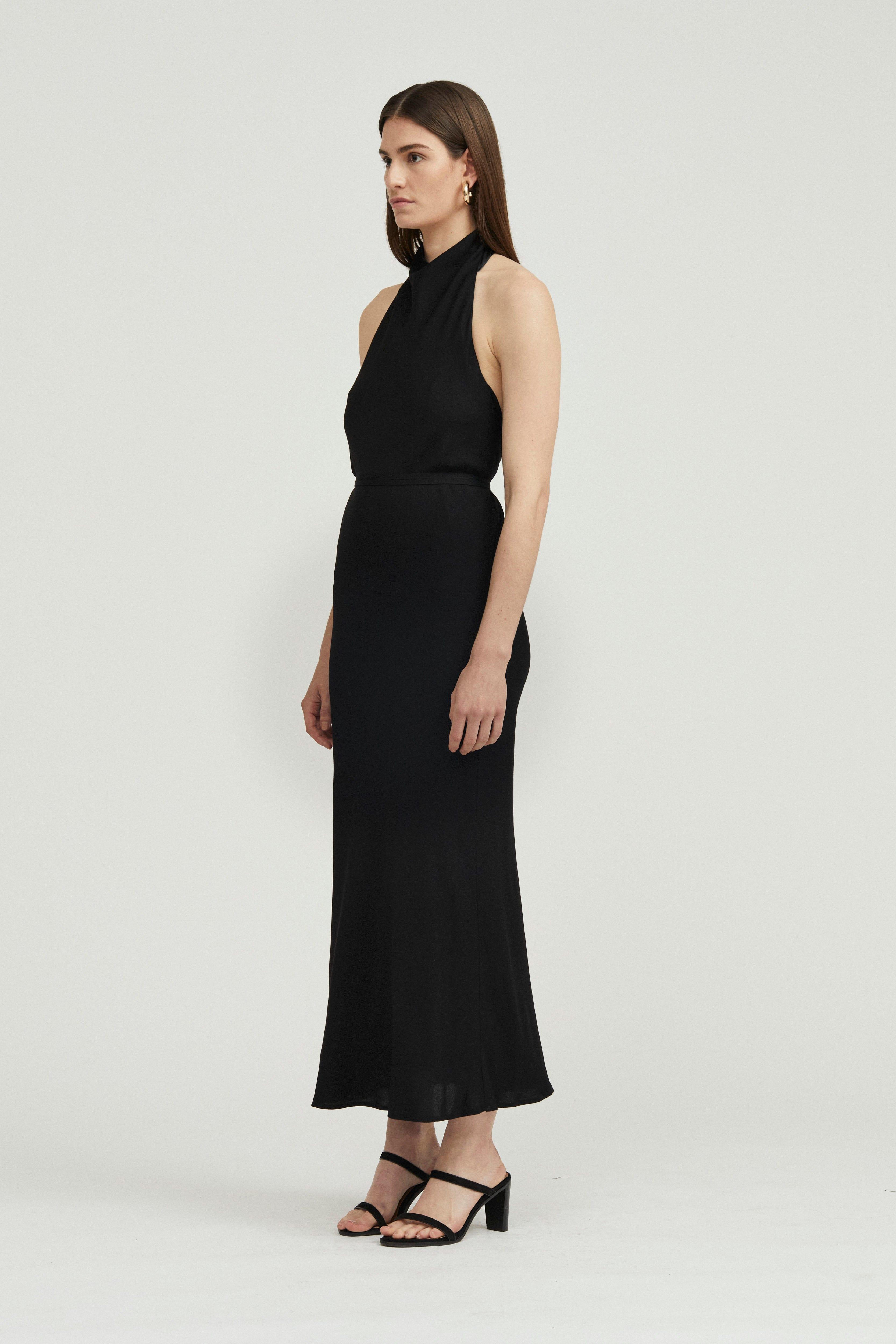 Unveil a new standard of modern allure with the Day Dreamer Kite Maxi Dress in black. The meticulous design, featuring a raised cowl neck and kite-shaped wrap waistline, exudes a sense of timeless modernism. Featuring a halter with a hand-sewn hook-and-eye closure and tie detailing, this dress allows for versatile styling and a sculptural silhouette. Composed of 54% Viscose and 46% Lenzing™ Ecovero™ Rayon, this dress has a light and dry-touch feel, making it a sophisticated choice for various occasions.