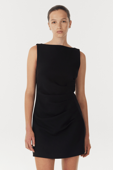 Step into sophistication with the Enigma Tuck Dress, an iconic office to evening outfit. Featuring an arched curved neckline, with sculptural asymmetric tucks adorn the left side that hug the body and create a beautiful drape effect. This long midi style dress is crafted from a textured, weighted fabrication that provides comfort alongside crease resistance, making this dress the perfect office and travel companion. Lux tailored finishes add an elevated touch to this style, with a tailored split vent, fully lined, with top stitch detailing and a blind hem.