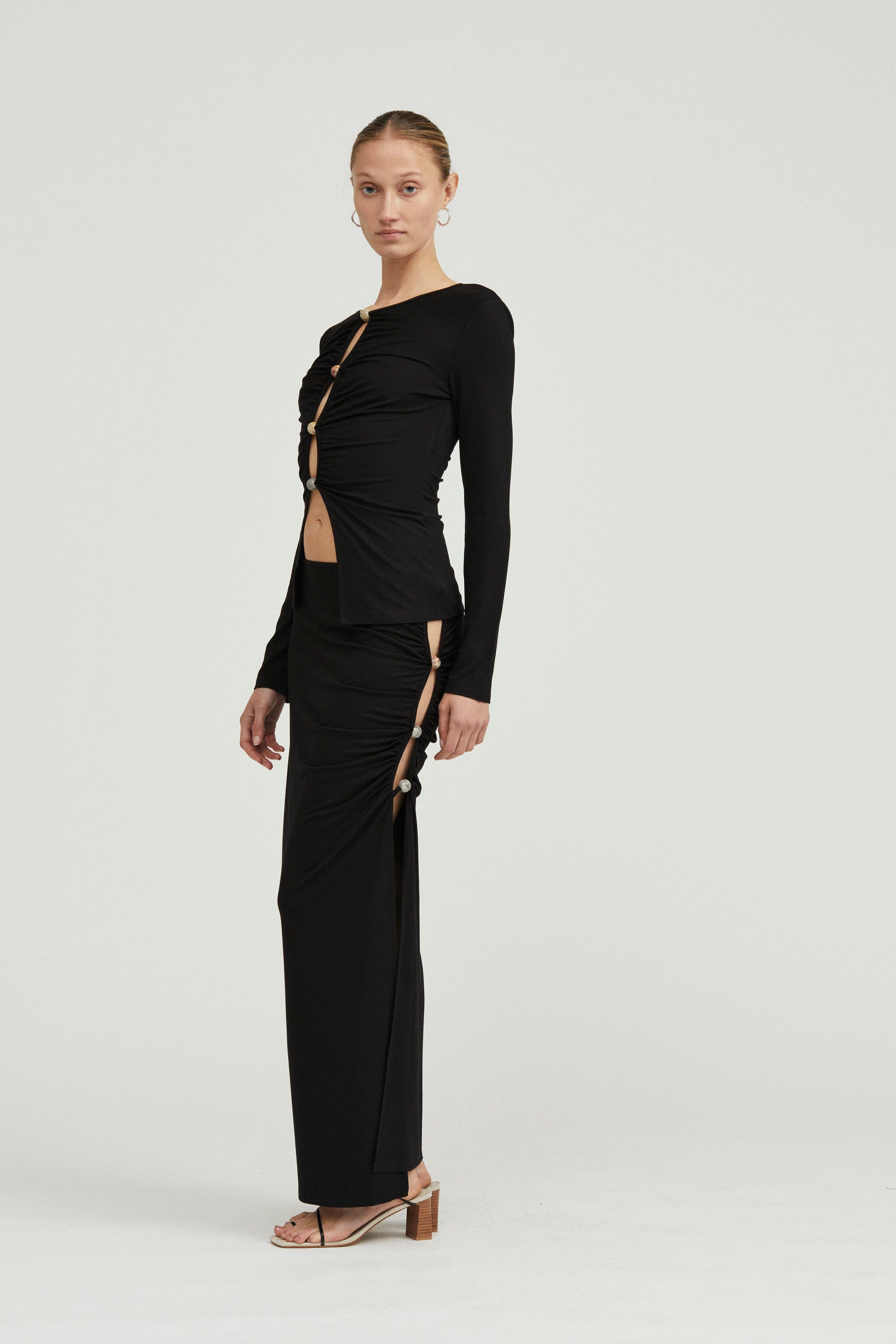 Embrace modern minimalism with the Hidden Gem Skirt in classic black; a masterpiece of comfort and style. Beautifully crafted from 92% bamboo and 8% spandex, the light-weight, soft-touch stretch fabrication provides a luxurious feel against your skin. This maxi-length skirt is adorned with four organic custom-cut stones along the sides, adding a touch of unique sophistication. Wear it high or mid-waist for individual style preference, and revel in the side gathering that creates a flattering silhouette. Open to the bottom, this skirt is a versatile statement piece for any occasion.