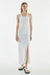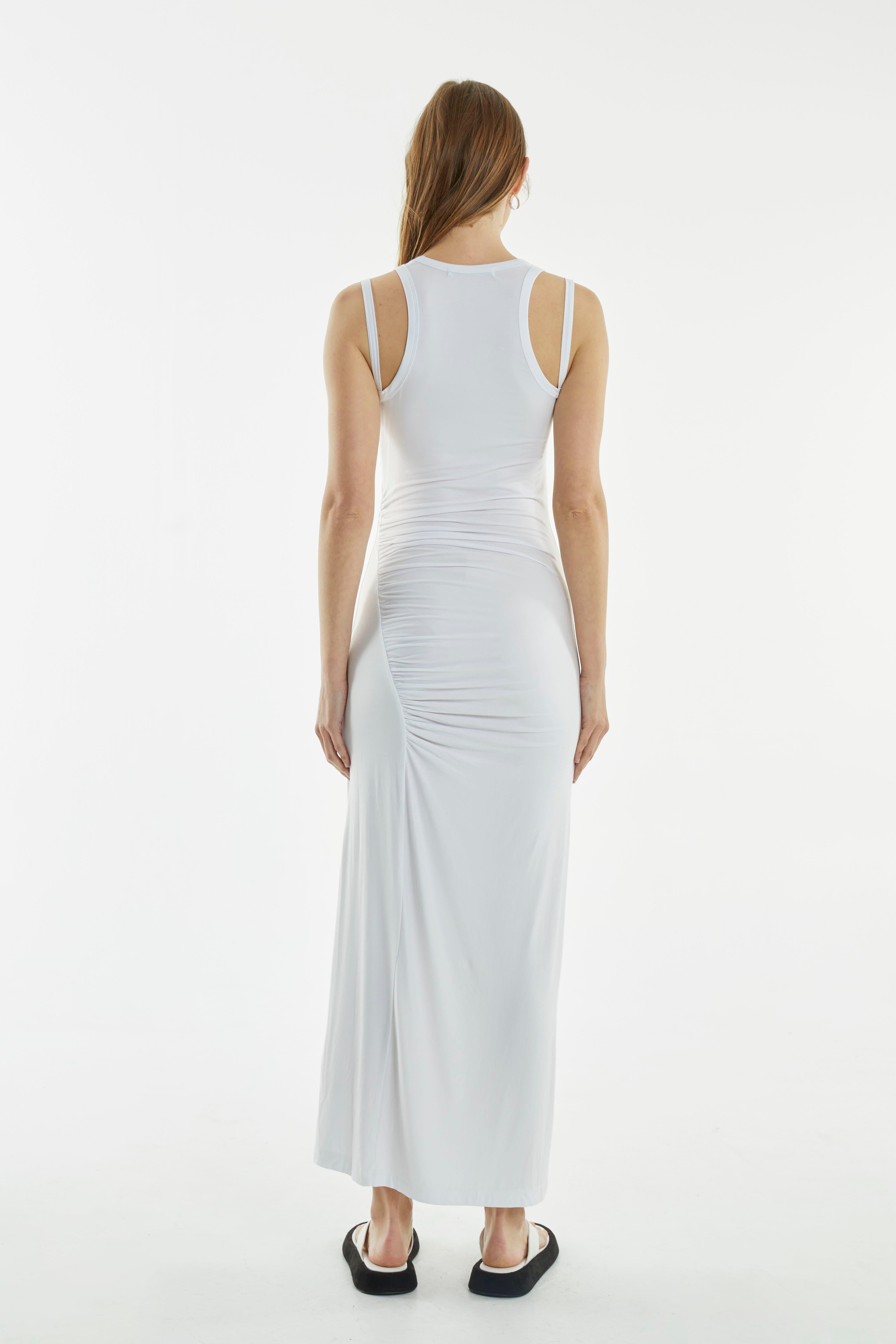 - Asymmetric gathered detailing; secured by self fabrication jersey band